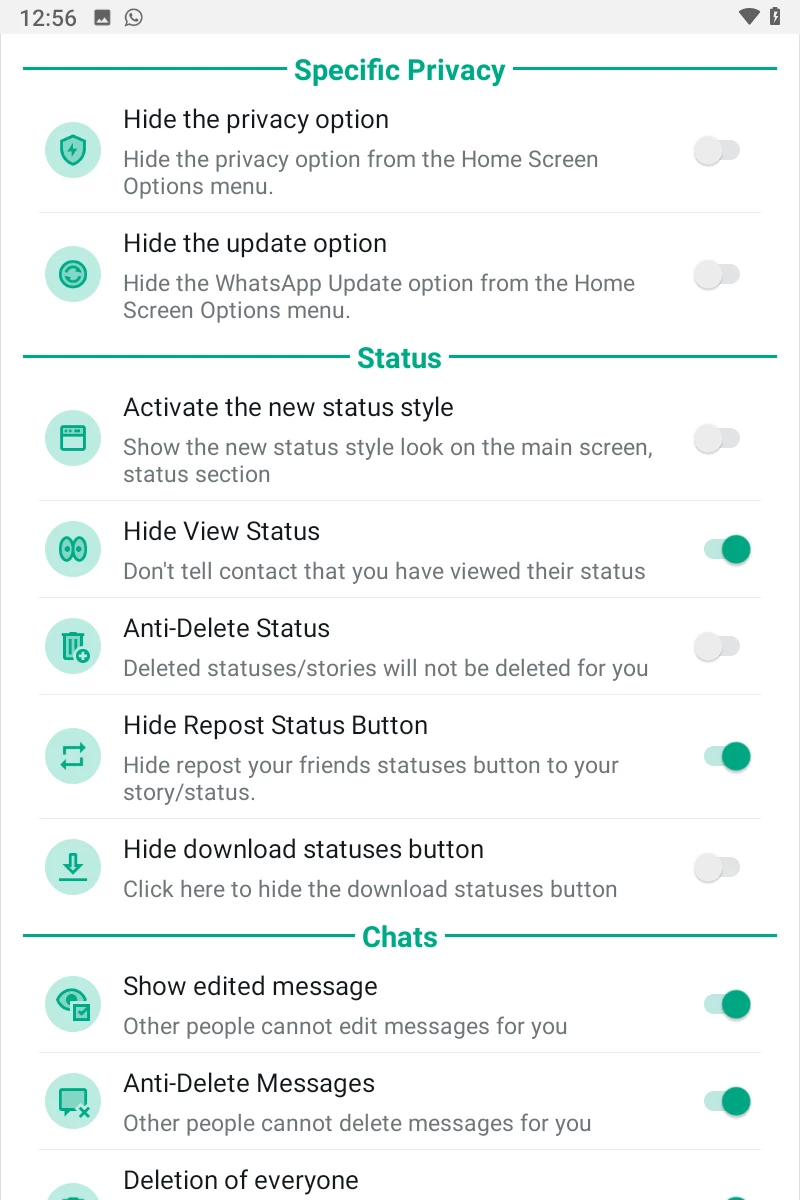 You don’t need to download a third-party downloader to download statuses from your favorite people . The built-in status downloader allows you to download and save statuses directly to your phone’s library. You can also enable the anti-view status feature so your contact won’t know you’ve viewed their status.